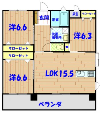間取り | 3LDK(洋6.6・6.6・6.3 LDK15.5) | 駐車場 | 有(空有り/敷地内) 2台(※軽限定・縦列) |